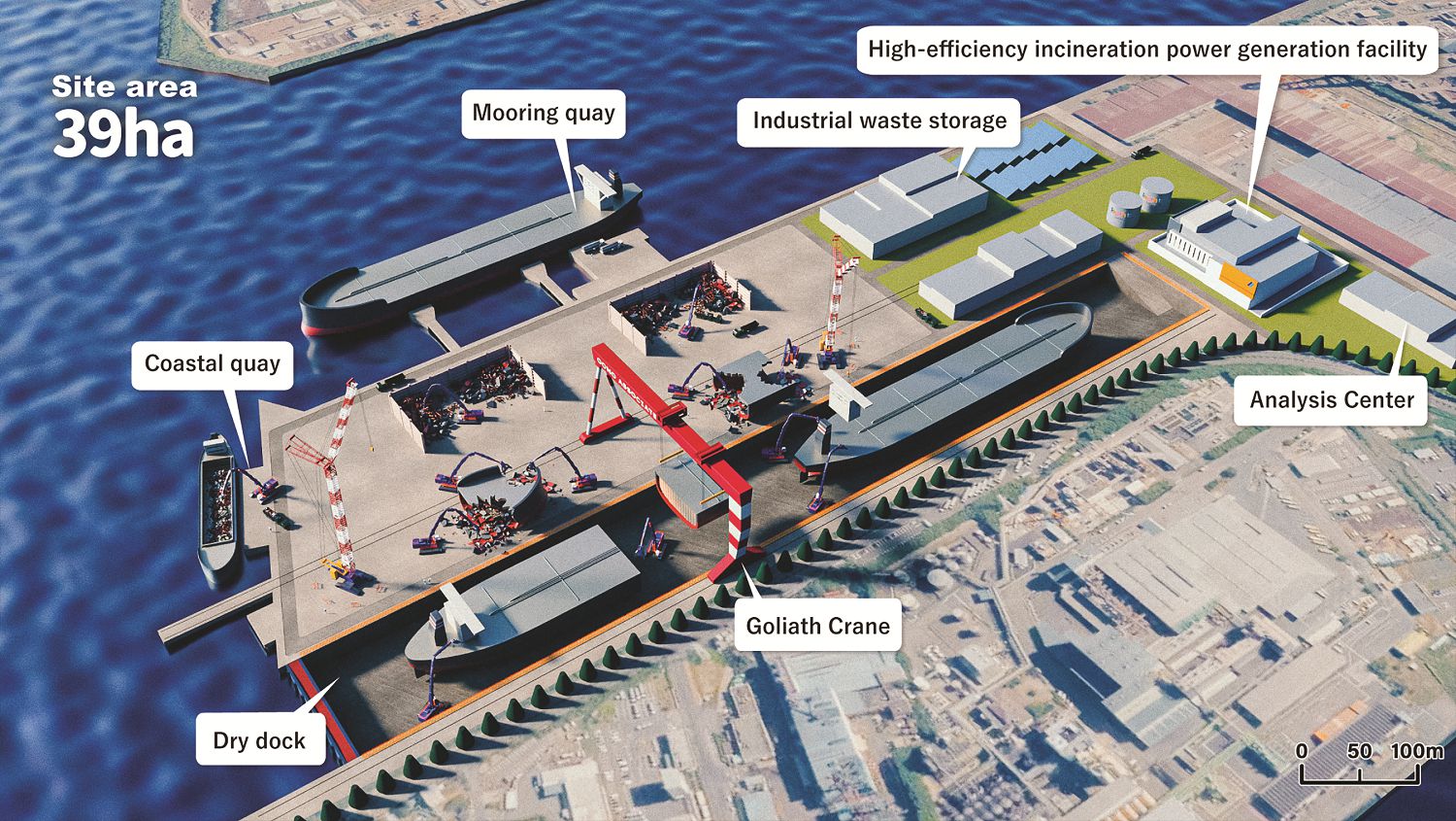 Advanced technologies, including a 5G remote control system and heavy machinery equipped with steel-cutting attachments, will be used to minimize worker exposure to hazardous materials and speed up dismantling timelines. The facility will also incorporate efficient incineration systems that generate power from waste produced during